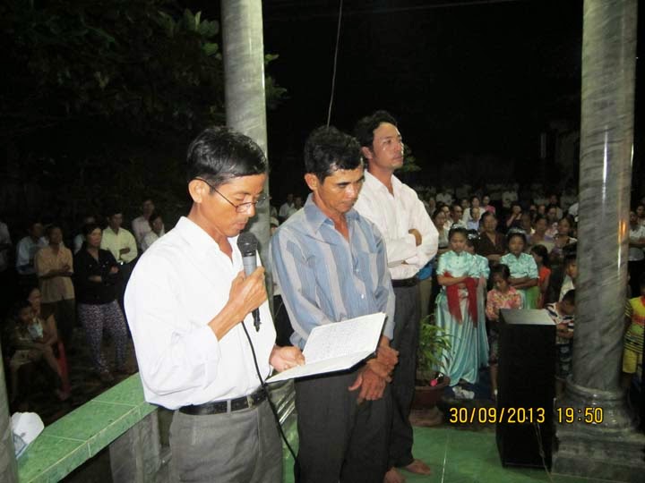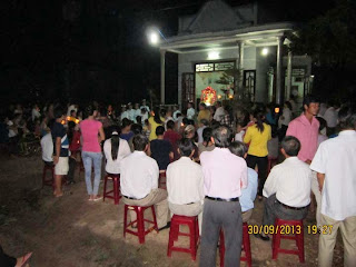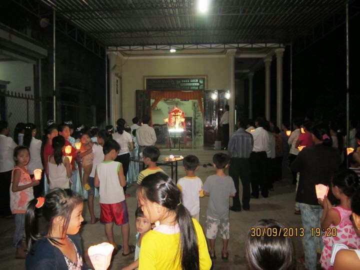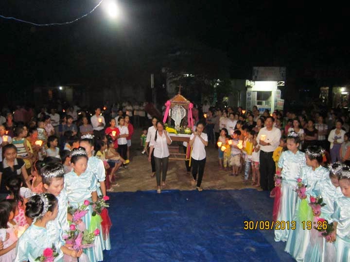 Tối ngày 30 - 9 - 2013 Lúc 19 giờ 30. Ban TV Giáo họ Vinh Sơn , Khai mạc đọc kinh Mân Côi liên gia , trong tháng mười . Với sự hiện diện của Cha Quản xứ , Thầy giúp xứ , Quý Soeur , HĐMV - Gx và trên 200 Giáo dân trong Gx , cùng đồng hành kiệu Mẹ từ nhà Chị Vinh đến nhà anh Nguyễn Văn Lộc . Cùng hiệp ý với các em trong đội Thánh vũ của Giáo họ dâng hoa , và cộng đoàn vang lời Kinh nguyện Mân Côi lên trước Thánh Tượng Mẹ , rất sốt sắng và trang nghiêm. Giờ kinh do Ban TV Giáo họ chủ sự . Sau kinh nguyện Cha Giacôbê mời gọi tất cả Bà con Giáo dân cần siêng năng tham dự các giờ kinh nguyện và Thánh Lễ mỗi ngày. giờ kinh được khép lại lúc 20 giờ.